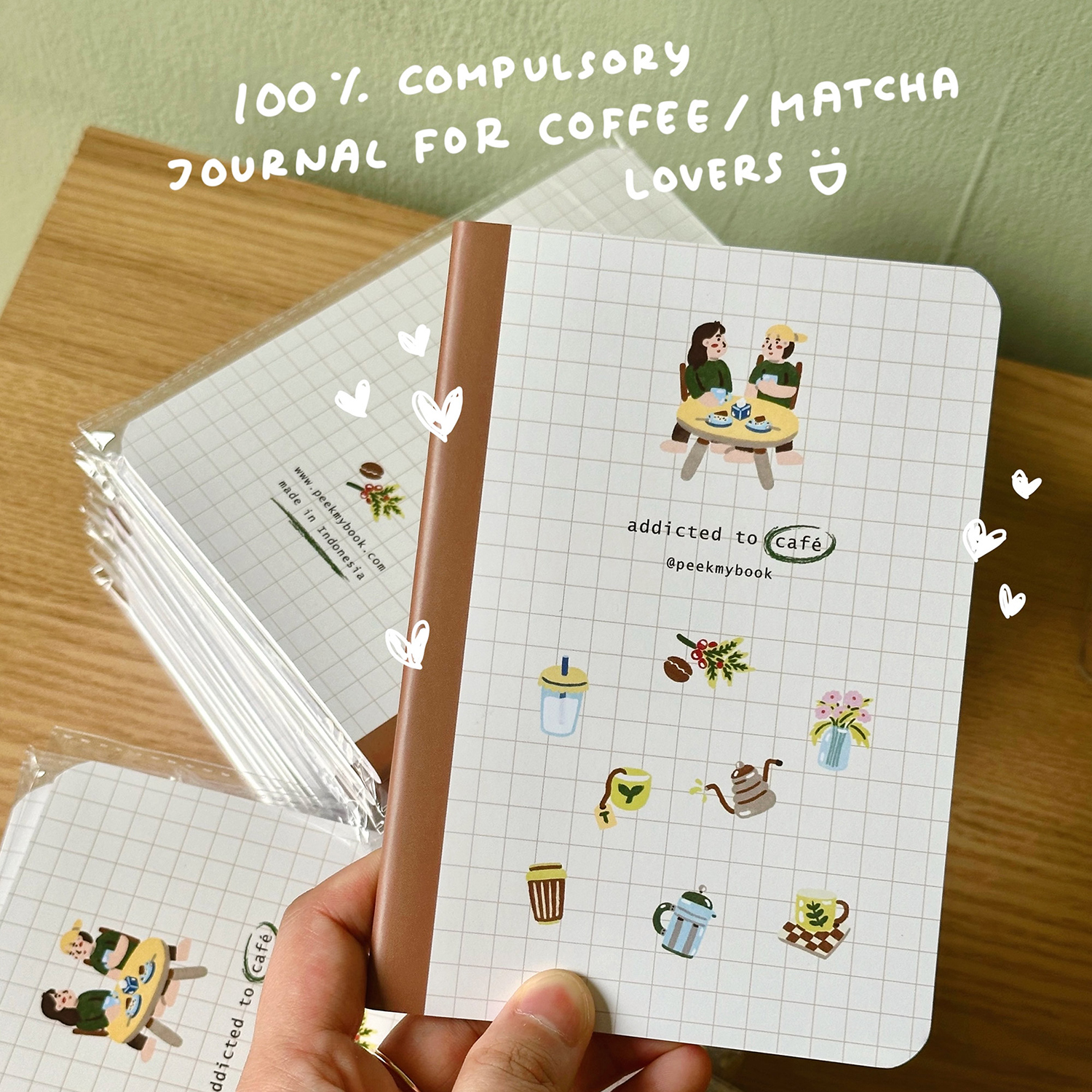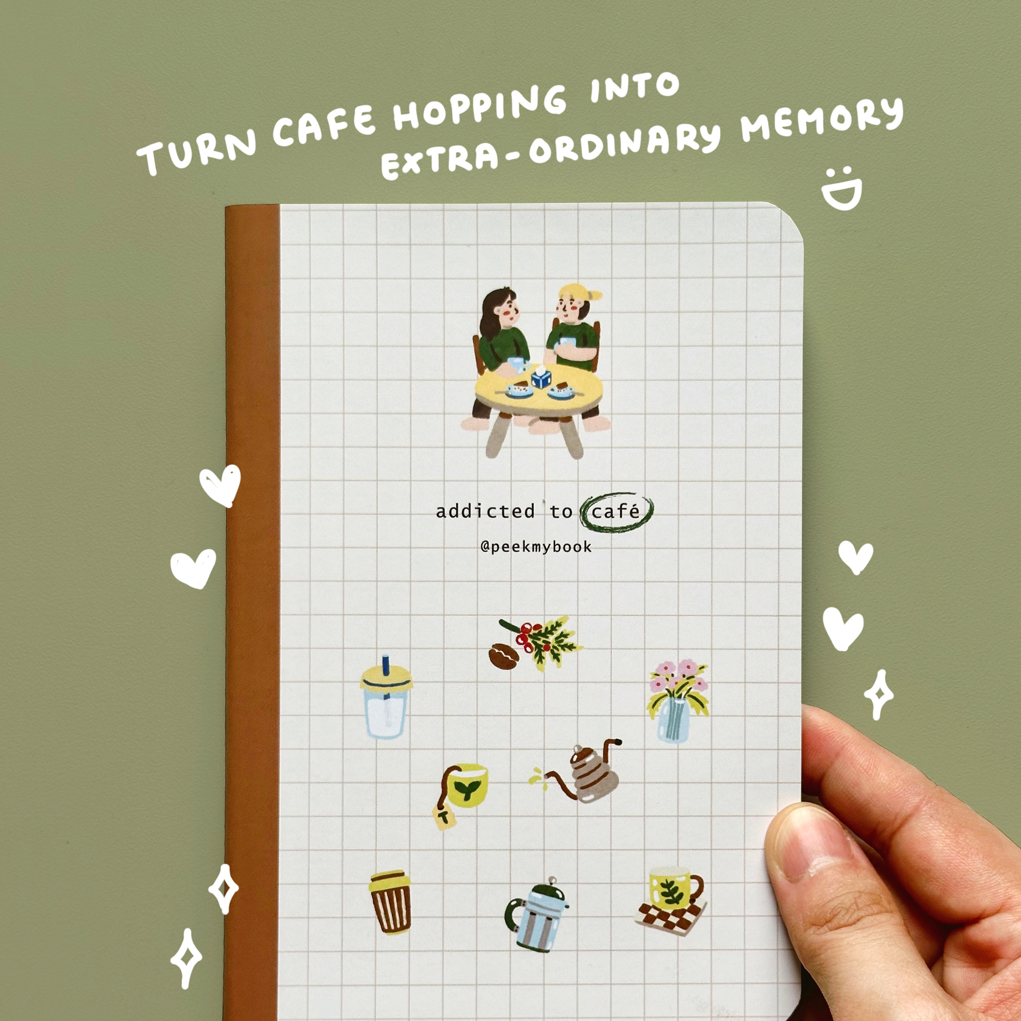 Addicted to Café adalah jurnal mini untuk para pencinta kafe. Gunakan untuk mencatat pengalamanmu mencicipi minuman dan mengunjungi tempat-tempat seru. Mau bikin lebih asik? Teteskan sedikit minumanmu ke halaman, biarkan kering, dan abadikan momennya!