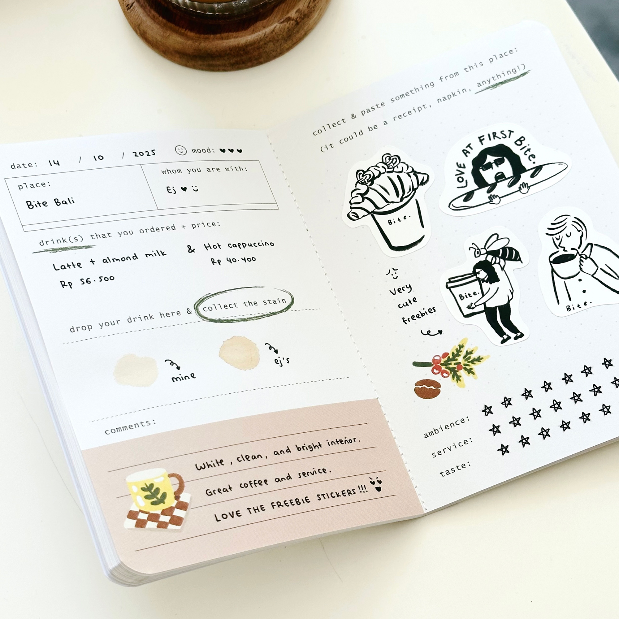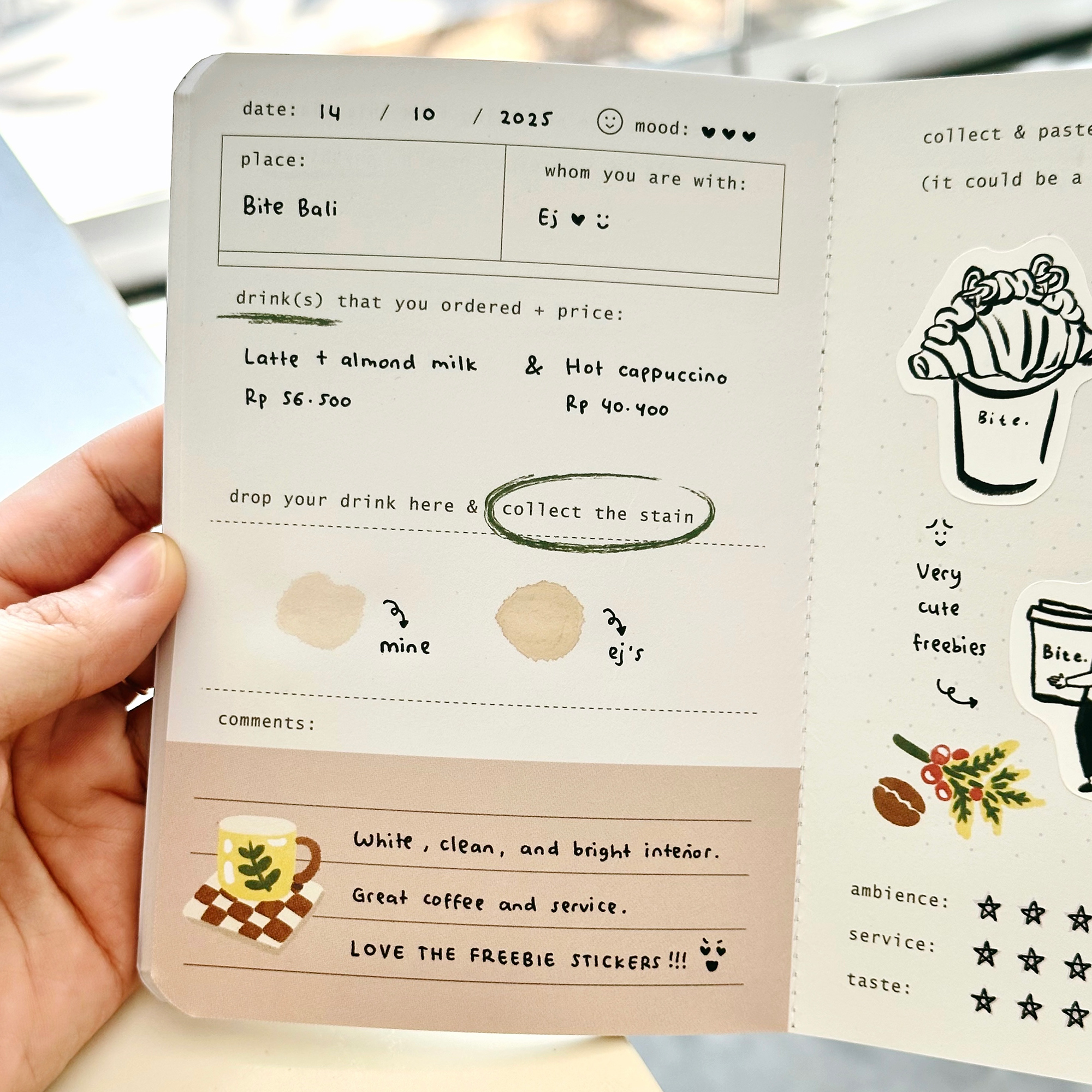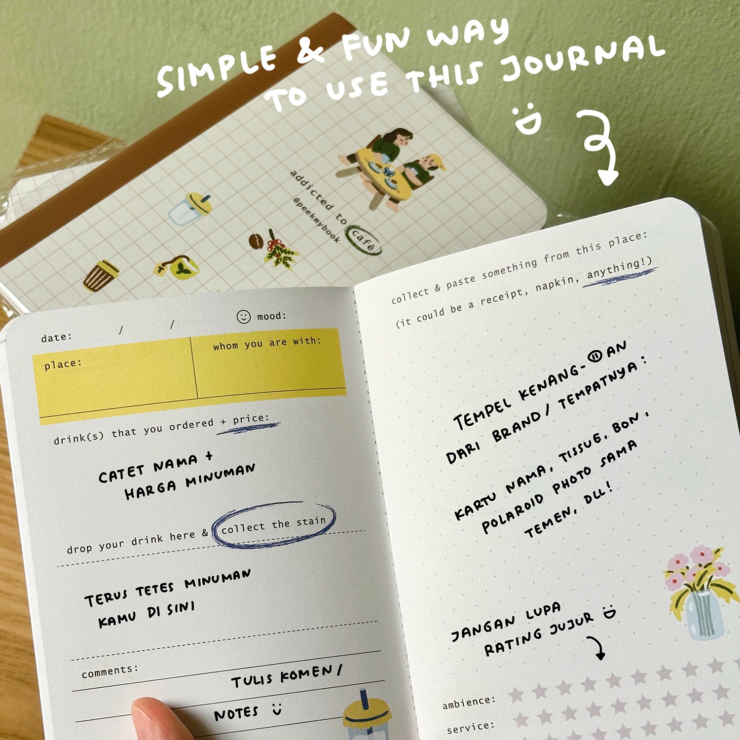 Tulis juga tentang harimu: Gimana suasana hati kamu waktu itu? Gimana rasa minumannya? Harganya mahal ga? Buku ini cocok untuk siapa saja—pria maupun wanita, pecinta kopi mau pun matcha—yang suka melakukan hal-hal seru, kreatif, dan beda dari biasanya. Dan jujur aja, siapa sih yang gak suka nongkrong di kafe jaman sekarang hihi? ????